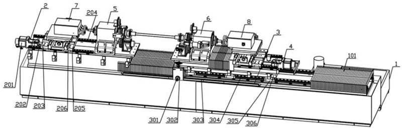 為了解決上述問題,本實用新型的目的在于提供了一種磨削效率高、管體兩端直線度好、適用不同長度的管體磨削和開環(huán)形槽的碳化硅管體雙頭打磨車床。