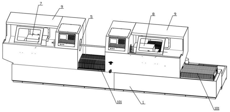 圖5是本實用新型碳化硅管體雙頭打磨車床的長管加工示意圖;