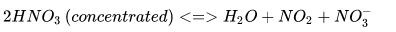 4、硝酸的氧化性與其濃度成正比。稀硝酸與金屬反應(yīng)生成一氧化氮,濃硝酸與金屬反應(yīng)同樣也會生成一氧化氮,但濃硝酸的氧化性比稀硝酸強,一氧化氮剛反應(yīng)出來,就被硝酸根離子在氫離子存在的情況下氧化成二氧化氮。方程式如下:
