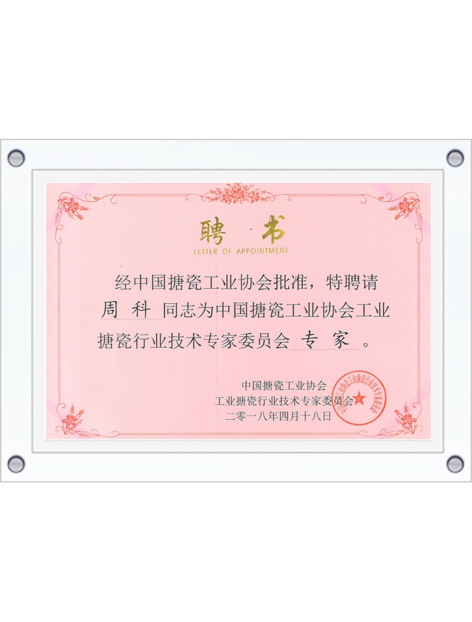 中國(guó)搪瓷工業(yè)協(xié)會(huì)專(zhuān)家聘書(shū)