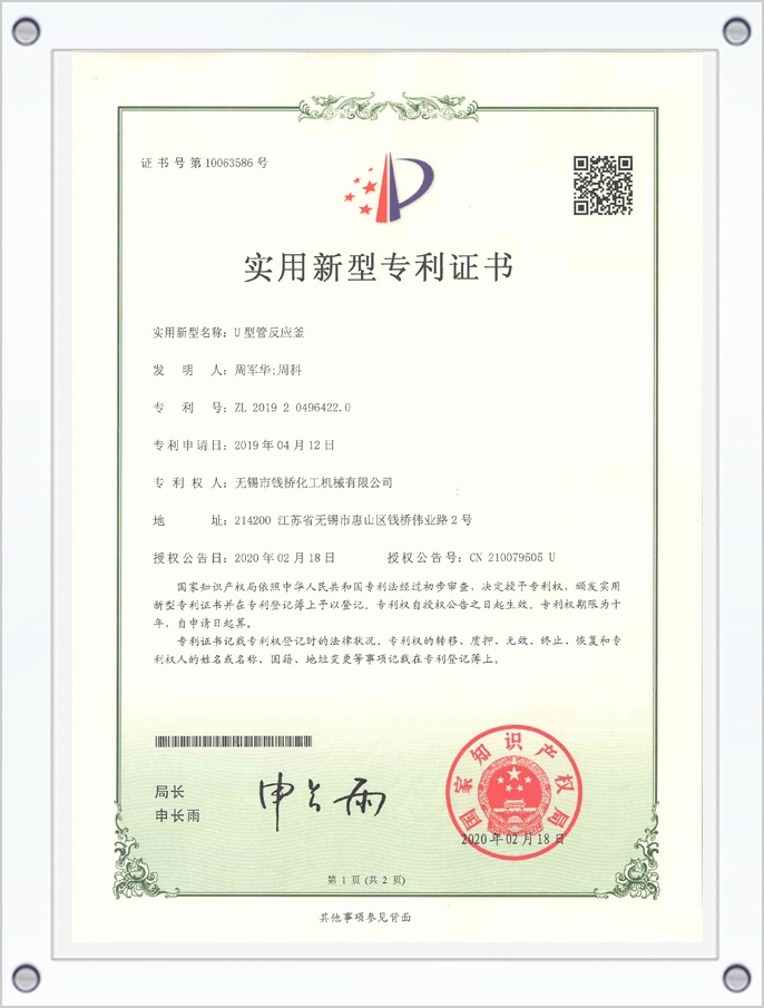 U型管反應(yīng)釜專(zhuān)利證書(shū)