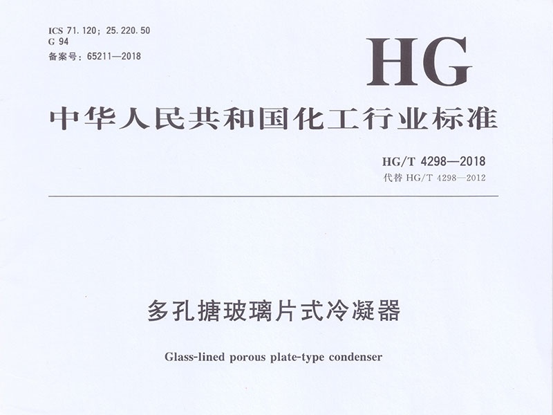無錫錢橋化工機械有限公司參與起草中華人民共和國化工行業(yè)標(biāo)準(zhǔn)HG/T 4298-2018《多孔搪玻璃片式冷凝器》。 ...
